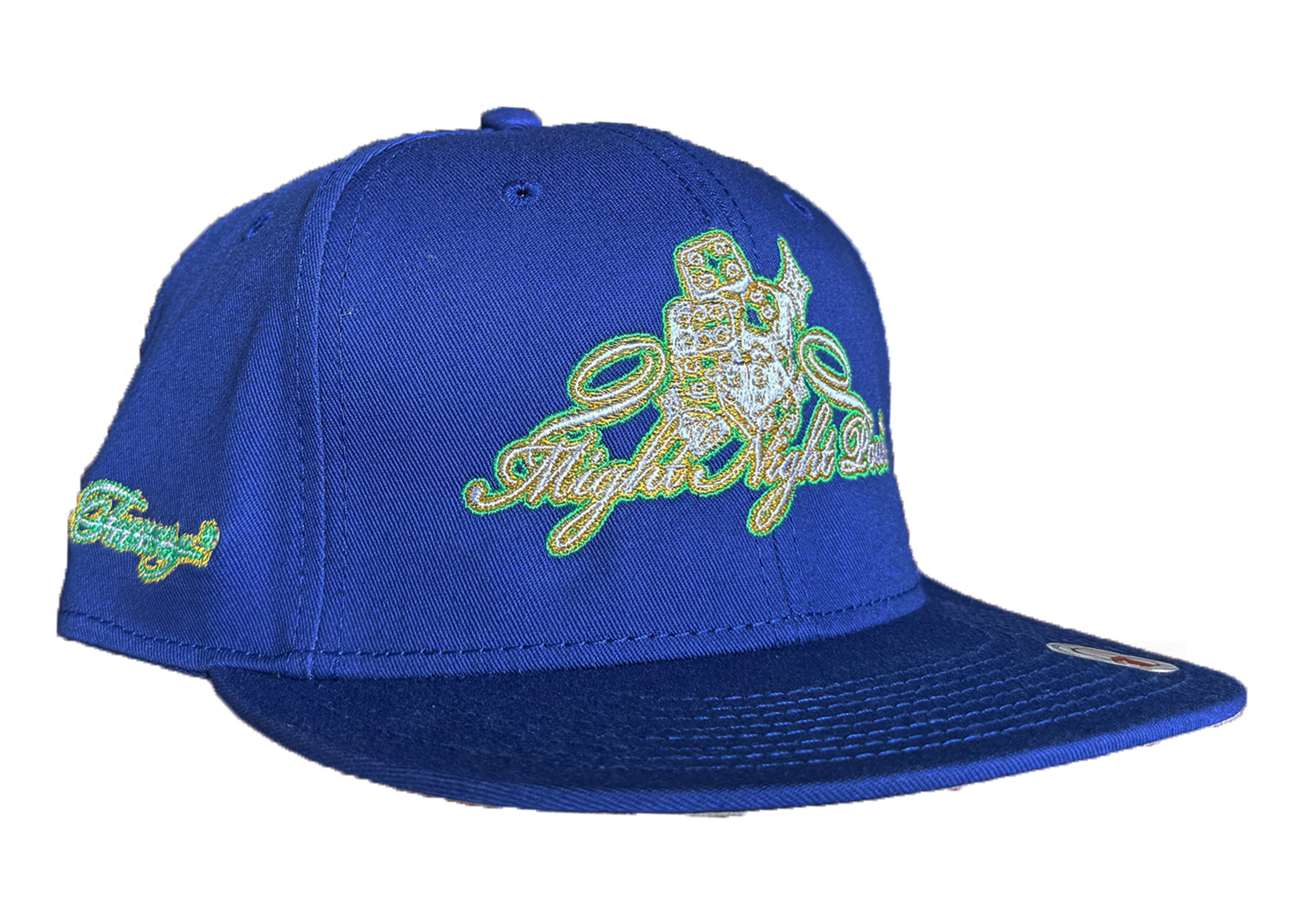 フロントには煌びやかなダイスと流麗なスクリプトロゴの刺繍をあしらい、夜の遊び心とラグジュアリーな雰囲気を表現しています。グリーンとホワイトの刺繍糸がブルーのボディに映え、立体感と高級感を演出。